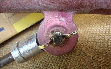 - Appoggiacanna “Ercole” con vite di fissaggio per la regolazione dell’inclinazione in alluminio anodizzato viola art. B14027 (vedi allegato da catalogo Ravizza 1963)