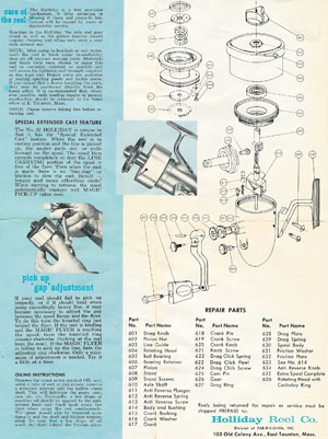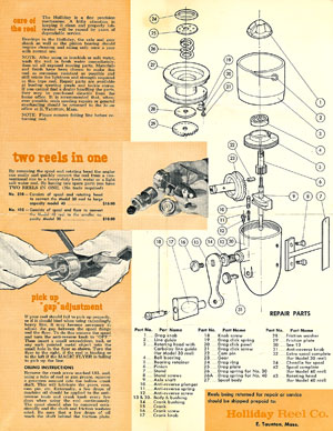 Una curiosità, il documento sopra esposto evidenzia come fosse possibile intercambiare alcune parti. La dicitura "two reels in one" identificava proprio che si potevano avere due mulinelli di misura diversa sullo stesso corpo. Per attuare tale modifica bastava acquistare una girante e una bobina del modello "40" da sostituire a quella presente sul "30", come intuibile era valido anche il processo inverso. |