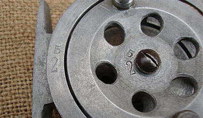 Ma la particolarità, sta nella realizzazione di una frizione rapida, mai vista su questo tipo di raccoglitori, si tratta di una leva posta al lato opposto della manovella, che ruotando su due piani inclinati, ne determinano una escursione in avanti, che provoca il serraggio della bobina.